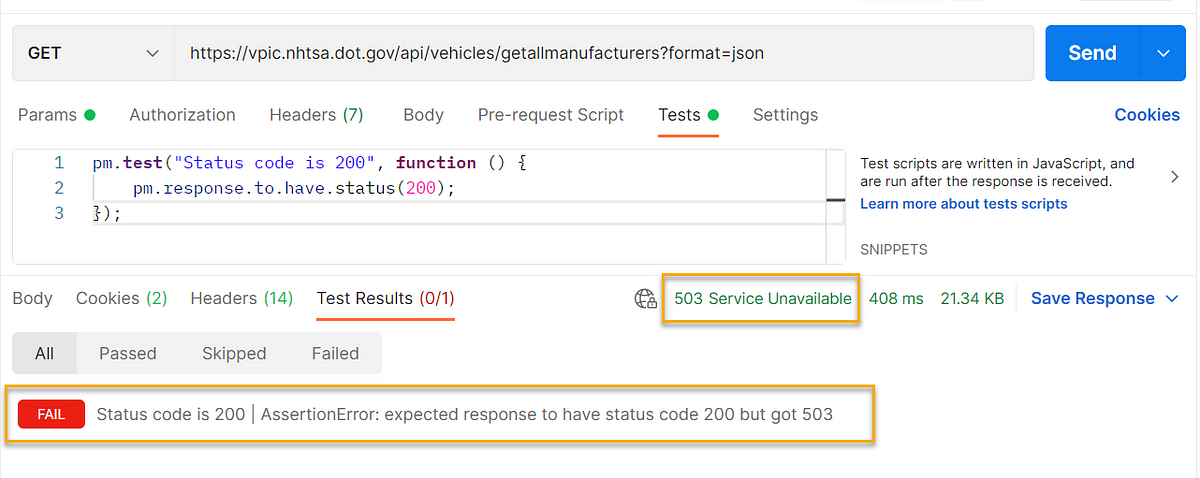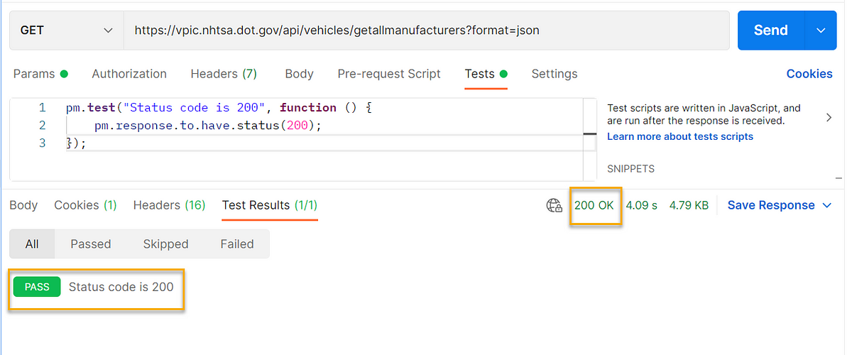 This snippet is now placed inside βTestsβ. Now if you hit βSendβ, your test case will either pass or fail based on the response code.