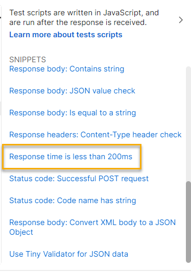 pm.test("Response time is less than 200ms", function () { pm.expect(pm.response.responseTime).to.be.below(200); });