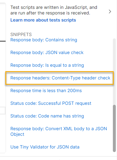 One of my favorite sections in Postman is the ready-made code snippets available in the left tab. Once you click the βTestsβ section, it will guide you on the list of snippets available.