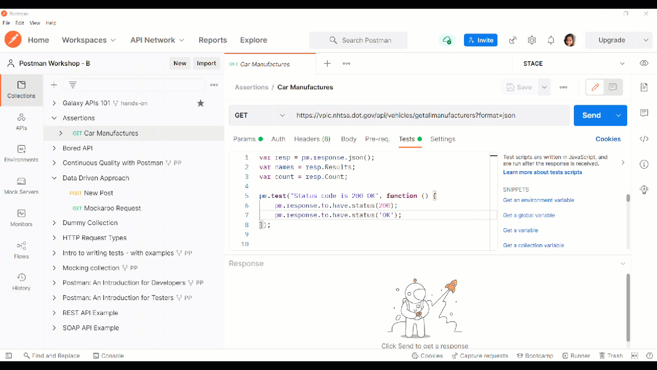 5. If you hit send, the same response is returned for every run, based on the example response added.