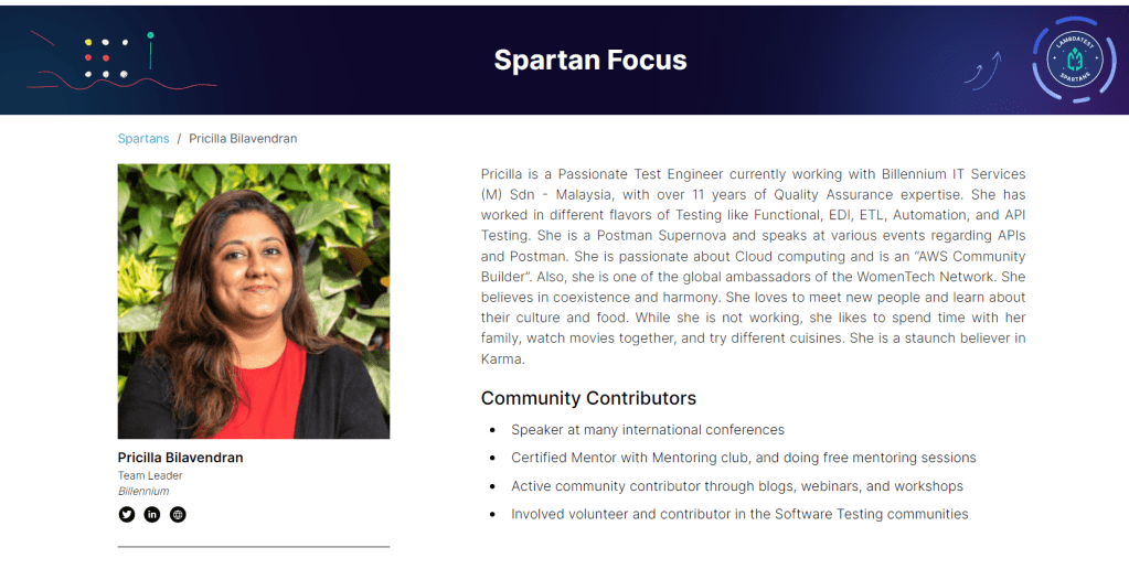 LambdaTest Spartans is a community advocacy program for innovators, builders, and change-makers, including community evangelists, who are transforming the testing & QA world. I am proudly associated with LambdaTest as a Spartan since last December (2022). You can watch the LambdaTest Spartans Panel discussion here which happened in December 2022.