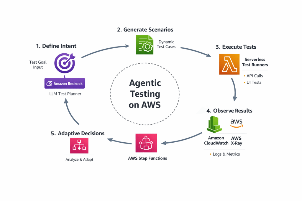 At a high level, an agentic testing system on AWS follows a loop: